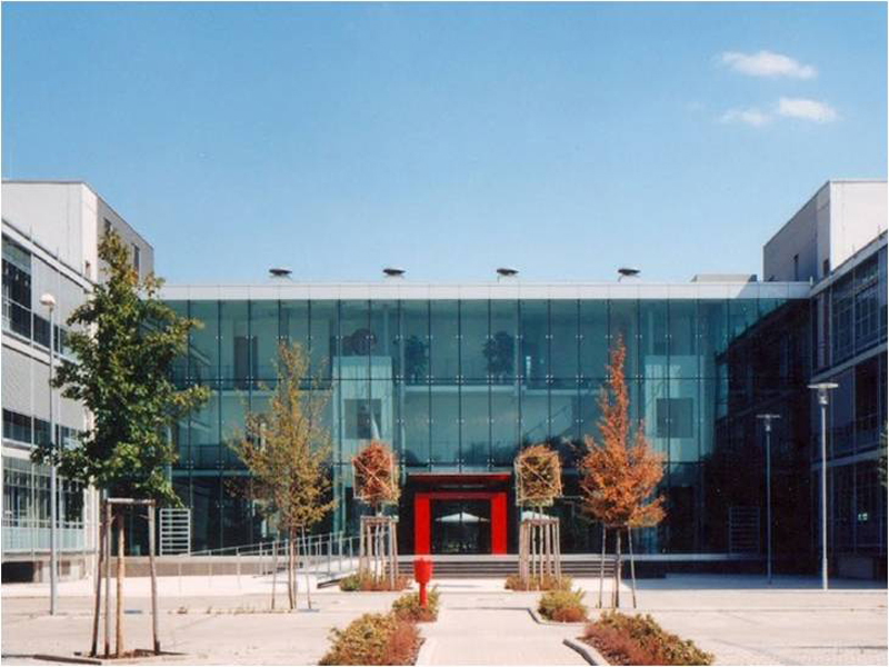 Schwebender Baukörper in Riegelform (H-förmig, dreigeschossig) mehrere Coffepoints in jeder Büroetage, punktgehaltene Eingangsfassade mit Windfanganlage, Blechfassaden, Sonnenschutzanlagen. Alle Räume sind klimatisiert, PR-Konstruktionen mit umlaufenden Fluchtbalkonen, Innenhofbereich mit großzügigem Wasserbecken und integrierter Holzdeckplattform, dreigeschossige Eingangshalle mit Casino und Vollküche bis zu 1500 Essen/Tag und Konferenzräumen.